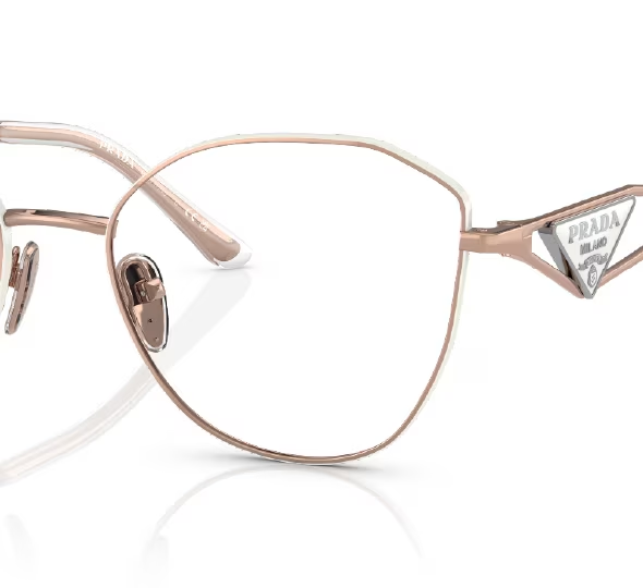 Varillas metálicas abiertas con el emblemático logotipo triangular de Prada y terminales de acetato para una mayor comodidad óptica.